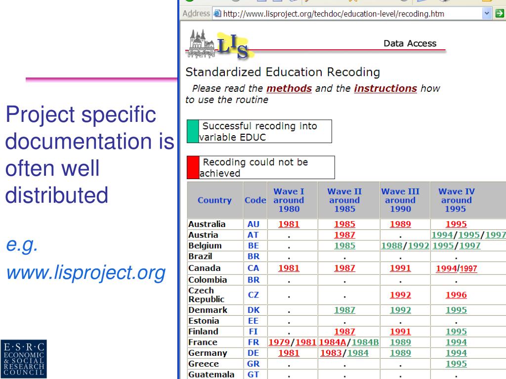 Measurement equivalence for comparisons – coding to the lowest common denominator? • Are the compatible categories equivalent? • Who does the work (data distributors and/or analysts)…? • …& who records it (e.g. Mohler et al., 2008)?