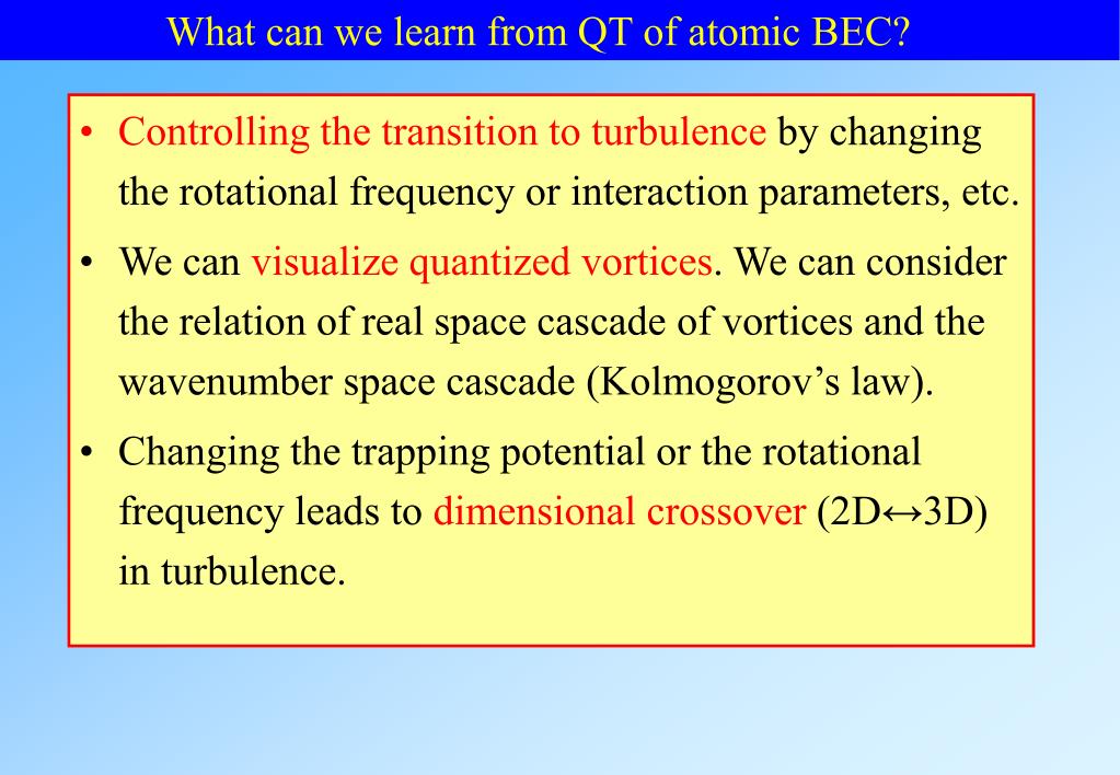 What can we learn from QT of atomic BEC? • Controlling the transition to turbulence by changing the rotational frequency or interaction parameters, etc. • We can visualize quantized vortices. We can consider the relation of real space cascade of vortices and the wavenumber space cascade (Kolmogorov’s law). • Changing the trapping potential or the rotational frequency leads to dimensional crossover (2D↔3D) in turbulence.