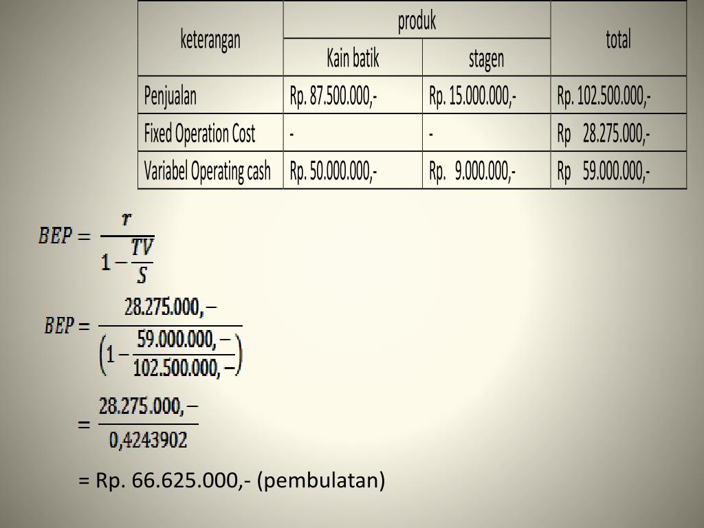 Contoh: Perusahaan “IndoJaya” bergerak dalam bidang produksi “kain batik” dan “stagen” merencanakan perluasan daerah pemasarannya. • Penjualan kain batik direncanakan sebesar 25.000 unit @ Rp 3.500 dan stagen sebesar 15.000 unit @ Rp 1.000. • Variable cost untuk setiap jenis produk adalah Rp 2.000 per unit kain batik, dan Rp 600 per unit stagen. • Fixed cost untuk kedua jenis produk tersebut adalah Rp 28.275.000. • Hitunglah break-even point untuk kedua jenis produk tersebut!