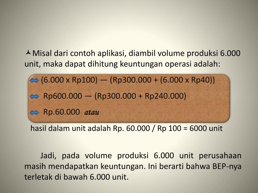 Misal dari contoh aplikasi, diambil volume produksi 6.000 unit, maka dapat dihitung keuntungan operasi adalah: hasil dalam unit adalah Rp. 60.000 / Rp 100 = 6000 unit Jadi, pada volume produksi 6.000 unit perusahaan masih mendapatkan keuntungan. Ini berarti bahwa BEP-nya terletak di bawah 6.000 unit. (6.000 x Rp100) — (Rp300.000 + (6.000 x Rp40)) Rp600.000 — (Rp300.000 + Rp240.000) Rp.60.000 atau