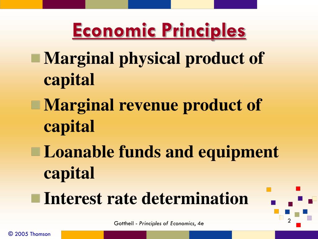 Economic Principles • Marginal physical product of capital • Marginal revenue product of capital • Loanable funds and equipment capital • Interest rate determination Gottheil - Principles of Economics, 4e