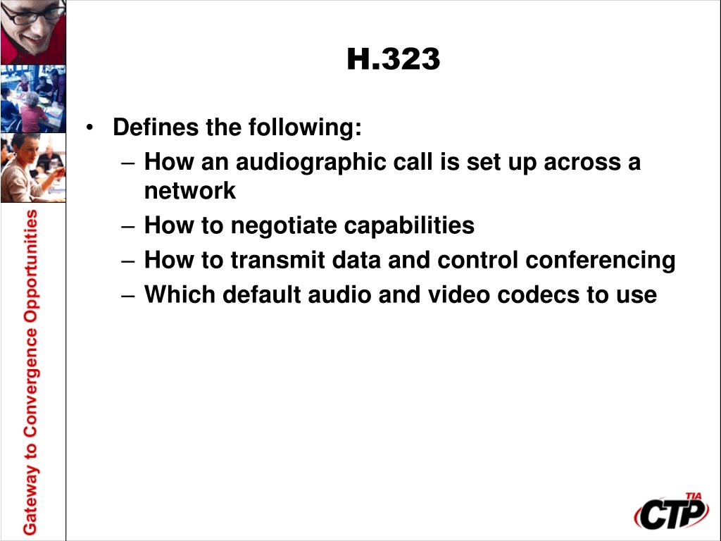 H.323 • Defines the following: • How an audiographic call is set up across a network • How to negotiate capabilities • How to transmit data and control conferencing • Which default audio and video codecs to use