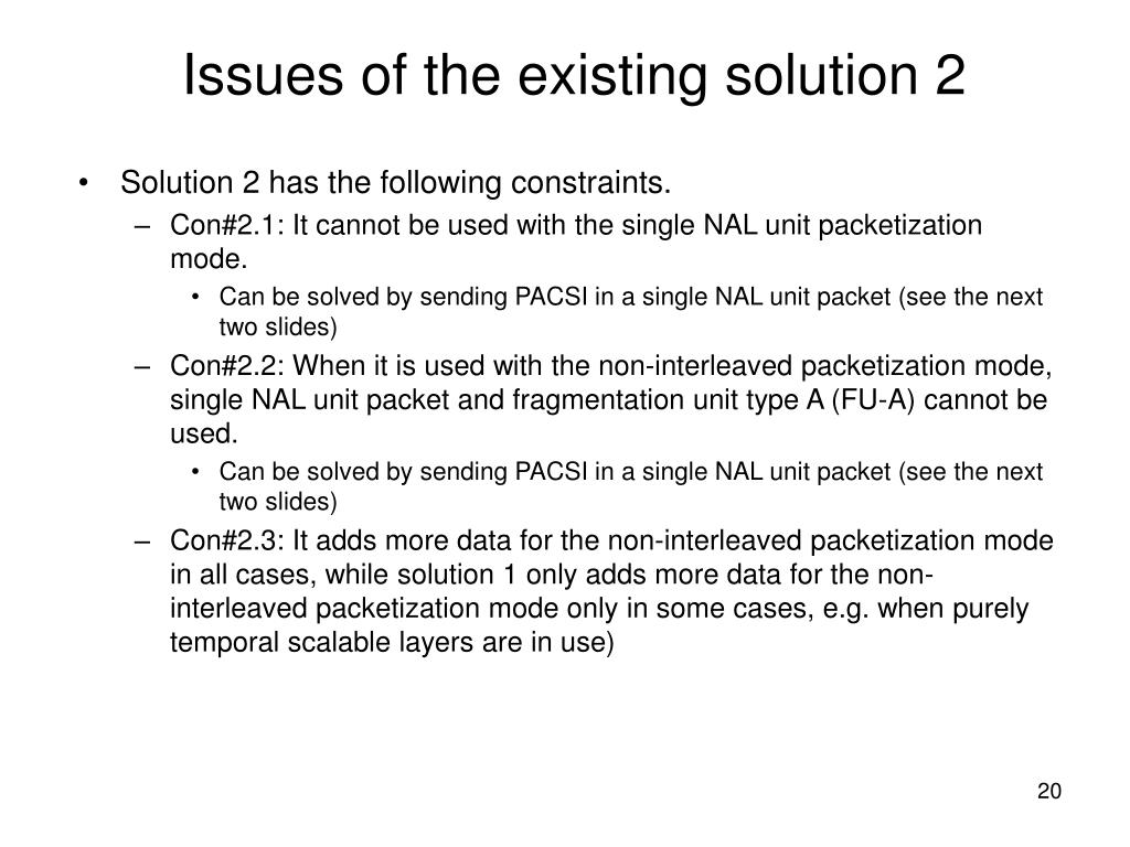 Issues of the existing solution 2 • Solution 2 has the following constraints. • Con#2.1: It cannot be used with the single NAL unit packetization mode. • Can be solved by sending PACSI in a single NAL unit packet (see the next two slides) • Con#2.2: When it is used with the non-interleaved packetization mode, single NAL unit packet and fragmentation unit type A (FU-A) cannot be used. • Can be solved by sending PACSI in a single NAL unit packet (see the next two slides) • Con#2.3: It adds more data for the non-interleaved packetization mode in all cases, while solution 1 only adds more data for the non-interleaved packetization mode only in some cases, e.g. when purely temporal scalable layers are in use)