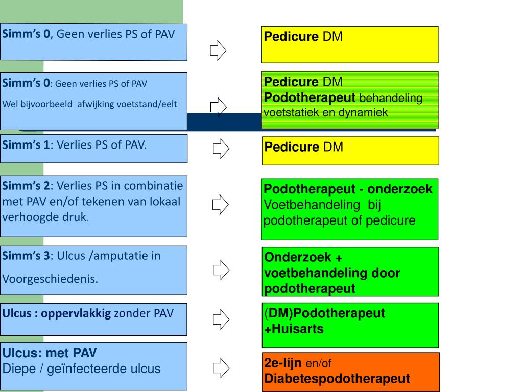 Simm’s 0, Geen verlies PS of PAV Pedicure DM Pedicure DM Podotherapeut behandeling voetstatiek en dynamiek Simm’s 0: Geen verlies PS of PAV Wel bijvoorbeeld afwijking voetstand/eelt Simm’s 1: Verlies PS of PAV. PedicureDM Simm’s 2: Verlies PS in combinatie met PAV en/of tekenen van lokaal verhoogde druk. Podotherapeut - onderzoek Voetbehandeling bij podotherapeut of pedicure Simm’s 3: Ulcus /amputatie in Voorgeschiedenis. Onderzoek + voetbehandeling door podotherapeut (DM)Podotherapeut +Huisarts Ulcus : oppervlakkig zonder PAV Ulcus: met PAV Diepe / geïnfecteerde ulcus 2e-lijn en/of Diabetespodotherapeut