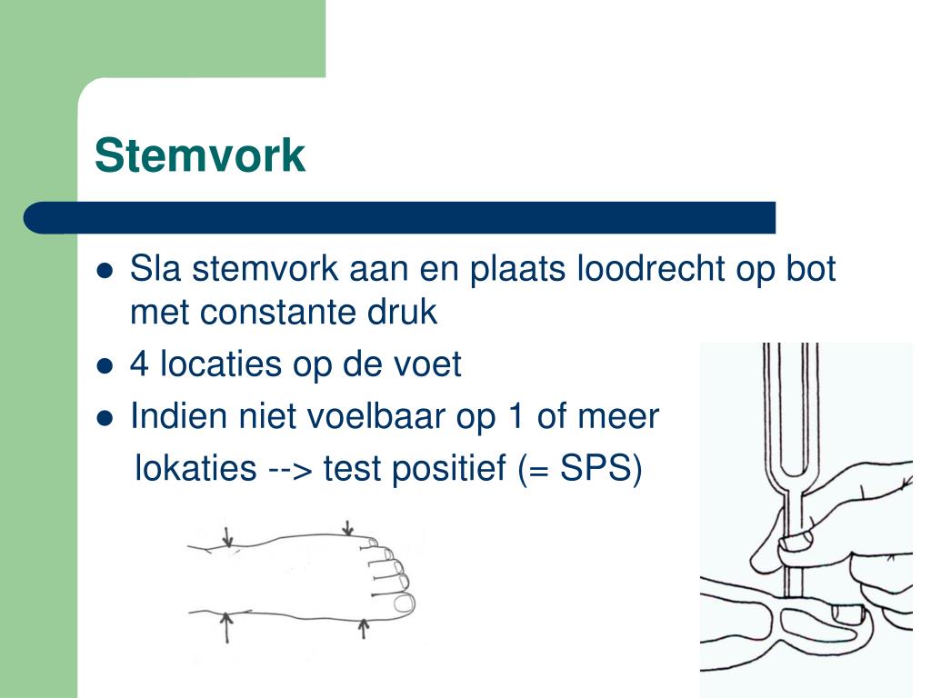Stemvork • Sla stemvork aan en plaats loodrecht op bot met constante druk • 4 locaties op de voet • Indien niet voelbaar op 1 of meer lokaties --> test positief (= SPS)