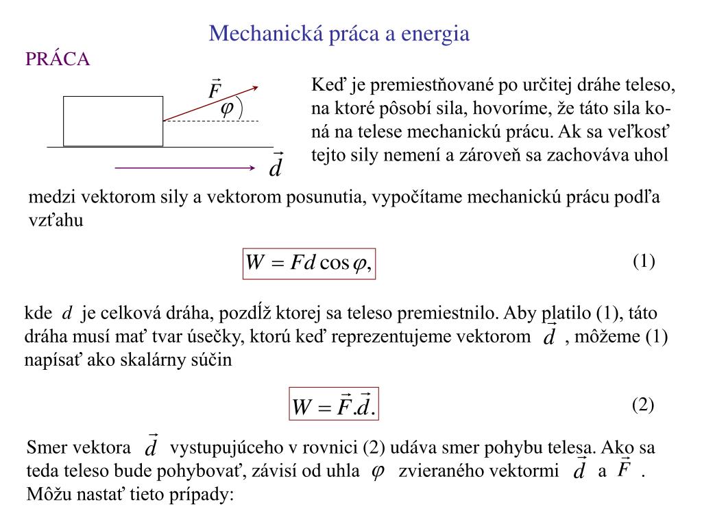 Mechanická práca a energia PRÁCA Keď je premiestňované po určitej dráhe teleso, na ktoré pôsobí sila, hovoríme, že táto sila ko- ná na telese mechanickú prácu. Ak sa veľkosť tejto sily nemení a zároveň sa zachováva uhol medzi vektorom sily a vektorom posunutia, vypočítame mechanickú prácu podľa vzťahu (1) kde d je celková dráha, pozdĺž ktorej sa teleso premiestnilo. Aby platilo (1), táto dráha musí mať tvar úsečky, ktorú keď reprezentujeme vektorom , môžeme (1) napísať ako skalárny súčin (2) Smer vektora vystupujúceho v rovnici (2) udáva smer pohybu telesa. Ako sa teda teleso bude pohybovať, závisí od uhla zvieraného vektormi a . Môžu nastať tieto prípady: