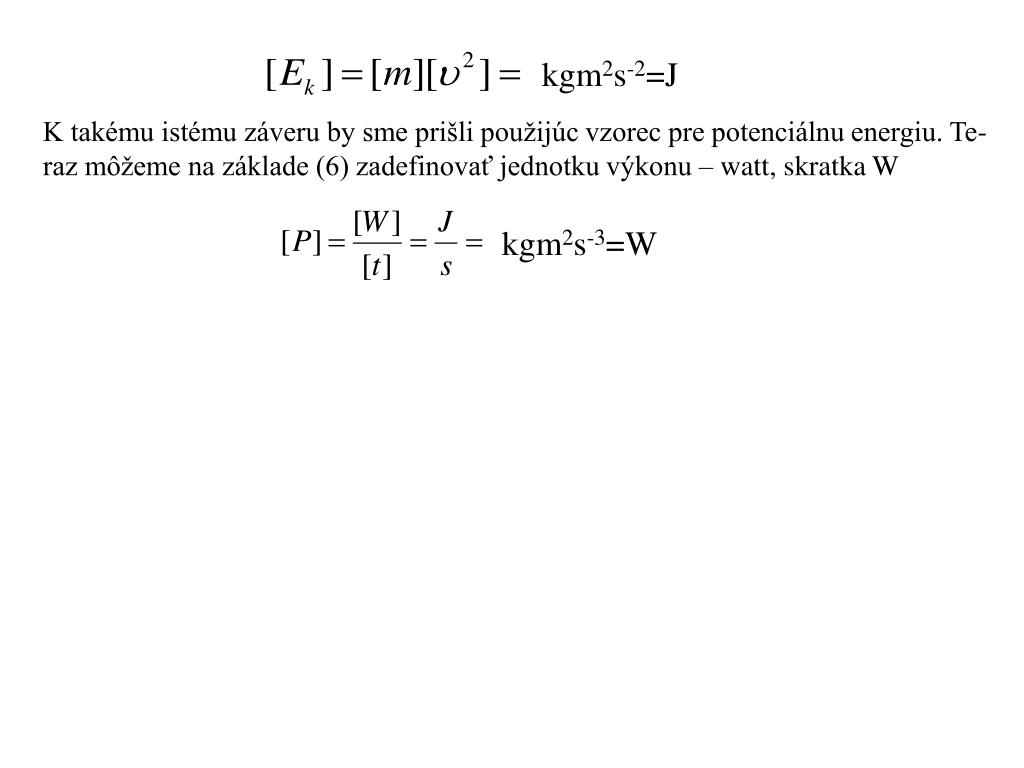 kgm2s-2=J K takému istému záveru by sme prišli použijúc vzorec pre potenciálnu energiu. Te- raz môžeme na základe (6) zadefinovať jednotku výkonu – watt, skratka W kgm2s-3=W