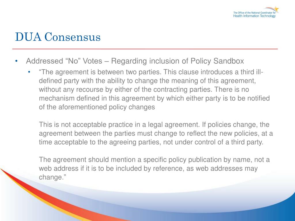 DUA Consensus • Addressed “No” Votes – Regarding inclusion of Policy Sandbox • “The agreement is between two parties. This clause introduces a third ill-defined party with the ability to change the meaning of this agreement, without any recourse by either of the contracting parties. There is no mechanism defined in this agreement by which either party is to be notified of the aforementioned policy changes This is not acceptable practice in a legal agreement. If policies change, the agreement between the parties must change to reflect the new policies, at a time acceptable to the agreeing parties, not under control of a third party.The agreement should mention a specific policy publication by name, not a web address if it is to be included by reference, as web addresses may change.”