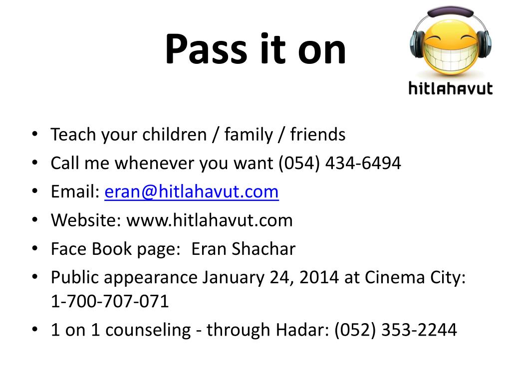 Pass it on • Teach your children / family / friends • Call me whenever you want (054) 434-6494 • Email: eran@hitlahavut.com • Website: www.hitlahavut.com • Face Book page: Eran Shachar • Public appearance January 24, 2014 at Cinema City: 1-700-707-071 • 1 on 1 counseling - through Hadar: (052) 353-2244