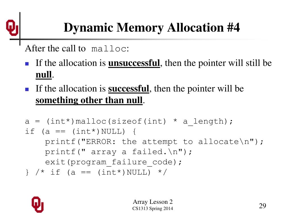 Dynamic Memory Allocation #4 After the call tomalloc: • If the allocation is unsuccessful, then the pointer will still be null. • If the allocation is successful, then the pointer will be something other than null. a = (int*)malloc(sizeof(int) * a_length); if (a == (int*)NULL) { printf("ERROR: the attempt to allocate\n"); printf(" array a failed.\n"); exit(program_failure_code); } /* if (a == (int*)NULL) */ Array Lesson 2 CS1313 Spring 2014