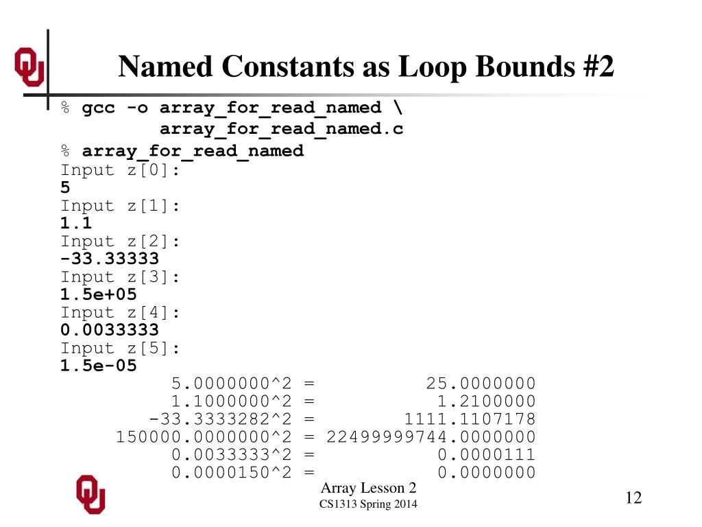 Named Constants as Loop Bounds #1 #include <stdio.h> int main () { /* main */ const int z_length = 6; const int lower_bound = 0; const int program_success_code = 0; float z[z_length], z_squared[z_length]; int index; for (index = lower_bound; index < z_length; index++) { printf("Input z[%d]:\n", index); scanf("%f", &z[index]); } /* for index */ for (index = lower_bound; index < z_length; index++) { z_squared[index] = z[index] * z[index]; } /* for index */ for (index = lower_bound; index < z_length; index++) { printf("%19.7f^2 = %19.7f\n", z[index], z_squared[index]); } /* for index */ return program_success_code; } /* main */ Array Lesson 2 CS1313 Spring 2014