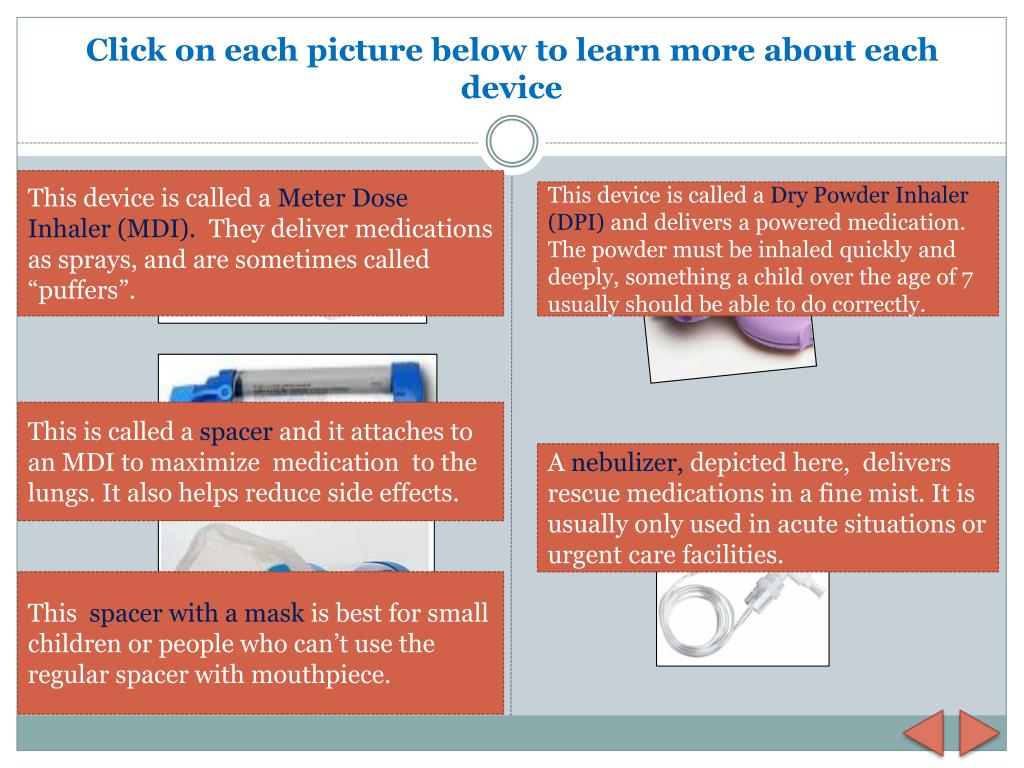 Click on each picture below to learn more about each device This device is called a Meter Dose Inhaler (MDI). They deliver medications as sprays, and are sometimes called “puffers”. This device is called a Dry Powder Inhaler (DPI) and delivers a powered medication. The powder must be inhaled quickly and deeply, something a child over the age of 7 usually should be able to do correctly. This is called a spacerand it attaches to an MDI to maximize medication to the lungs. It also helps reduce side effects. A nebulizer, depicted here, delivers rescue medications in a fine mist. It is usually only used in acute situations or urgent care facilities. This spacer with a mask is best for small children or people who can’t use the regular spacer with mouthpiece.