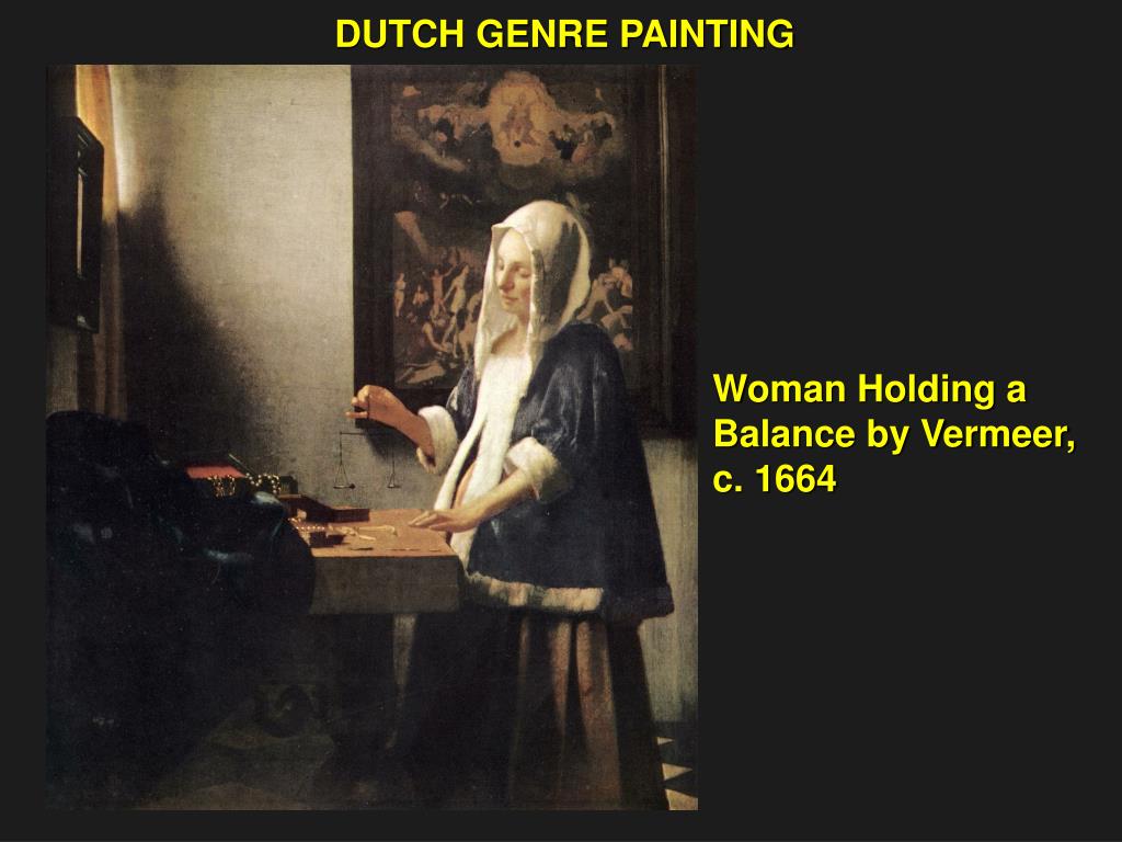 DUTCH GENRE PAINTING. Woman Holding a Balance by Vermeer, c. 1664. DUTCH GENRE PAINTING. Still Life by William Claesz. Heda. Feast of St. Nicholas by Jan Steen. DUTCH STILL LIFE: MORALIZING MEANINGS. Still Life by Willem Claesz. Heda (1636). Lemon: looks but has a bitter