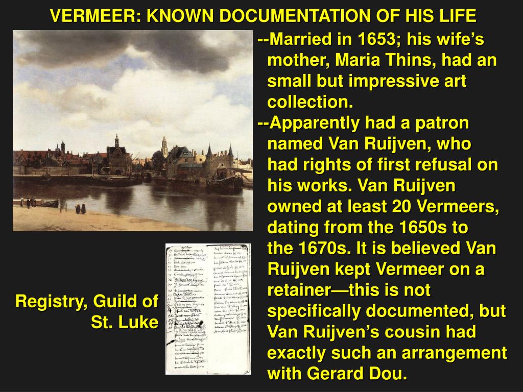 VERMEER: KNOWN DOCUMENTATION OF HIS LIFE --Married in 1653; his wife’s mother, Maria Thins, had an small but impressive art collection. --Apparently had a patron named Van Ruijven, who had rights of first refusal on his works. Van Ruijven owned at least 20 Vermeers, dating from the 1650s to the 1670s. It is believed Van Ruijven kept Vermeer on a retainer—this is not specifically documented, but Van Ruijven’s cousin had exactly such an arrangement with Gerard Dou. Registry, Guild of St. Luke