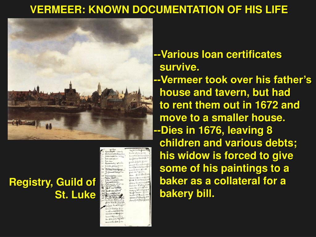 VERMEER: KNOWN DOCUMENTATION OF HIS LIFE --Various loan certificates survive. --Vermeer took over his father’s house and tavern, but had to rent them out in 1672 and move to a smaller house. --Dies in 1676, leaving 8 children and various debts; his widow is forced to give some of his paintings to a baker as a collateral for a bakery bill. Registry, Guild of St. Luke