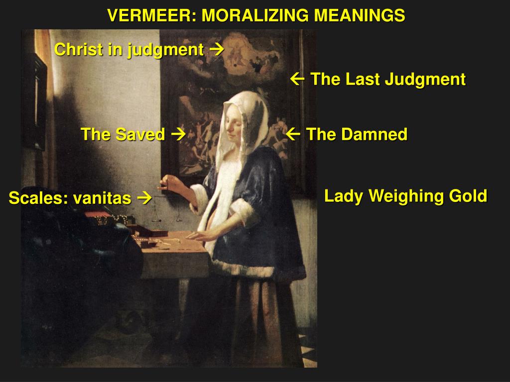 VERMEER: MORALIZING MEANINGS Christ in judgment The Last Judgment The Saved The Damned Lady Weighing Gold Scales: vanitas