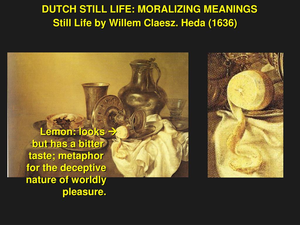 DUTCH STILL LIFE: MORALIZING MEANINGS Still Life by Willem Claesz. Heda (1636) Lemon: looks but has a bitter taste; metaphor for the deceptive nature of worldly pleasure.