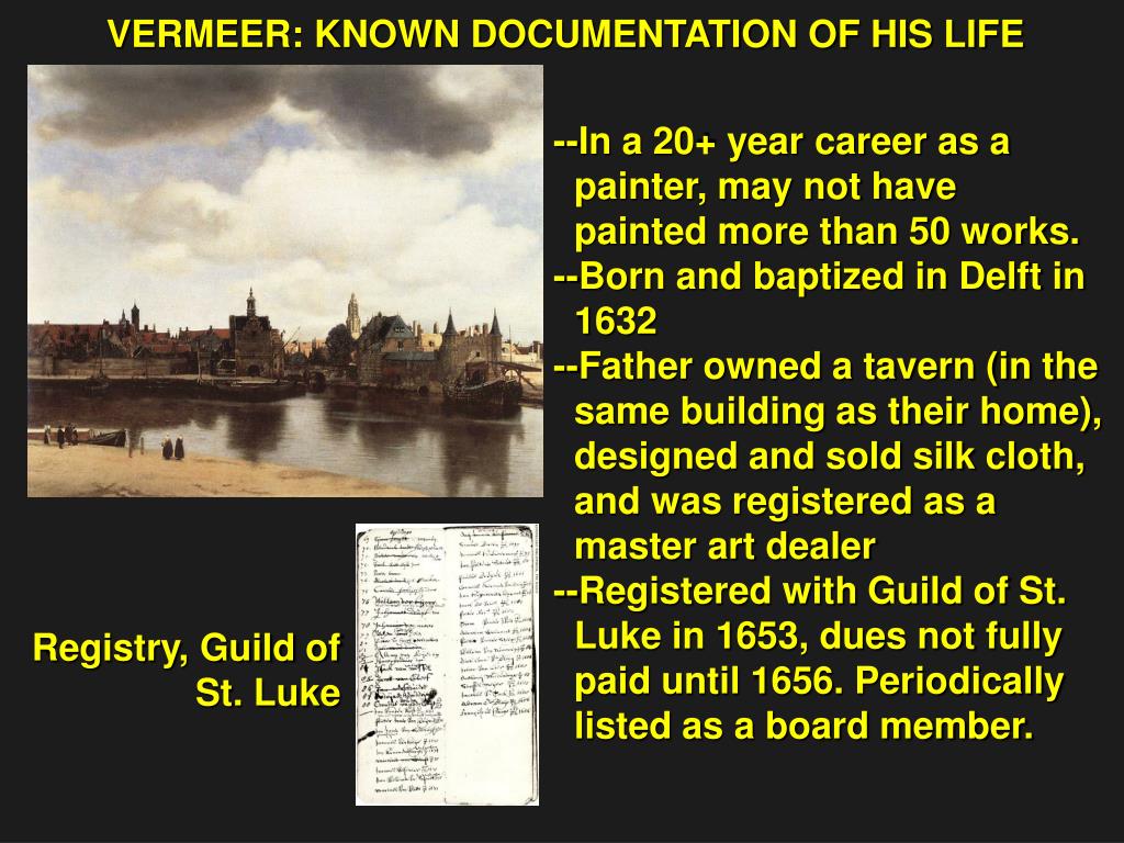 VERMEER: KNOWN DOCUMENTATION OF HIS LIFE --In a 20+ year career as a painter, may not have painted more than 50 works. --Born and baptized in Delft in 1632 --Father owned a tavern (in the same building as their home), designed and sold silk cloth, and was registered as a master art dealer --Registered with Guild of St. Luke in 1653, dues not fully paid until 1656. Periodically listed as a board member. Registry, Guild of St. Luke