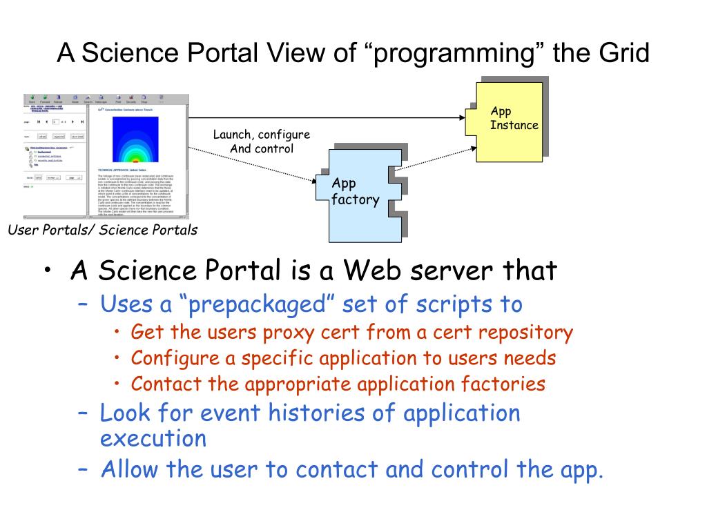 A Science Portal View of “programming” the Grid App Instance • A Science Portal is a Web server that • Uses a “prepackaged” set of scripts to • Get the users proxy cert from a cert repository • Configure a specific application to users needs • Contact the appropriate application factories • Look for event histories of application execution • Allow the user to contact and control the app. Launch, configure And control App factory User Portals/ Science Portals