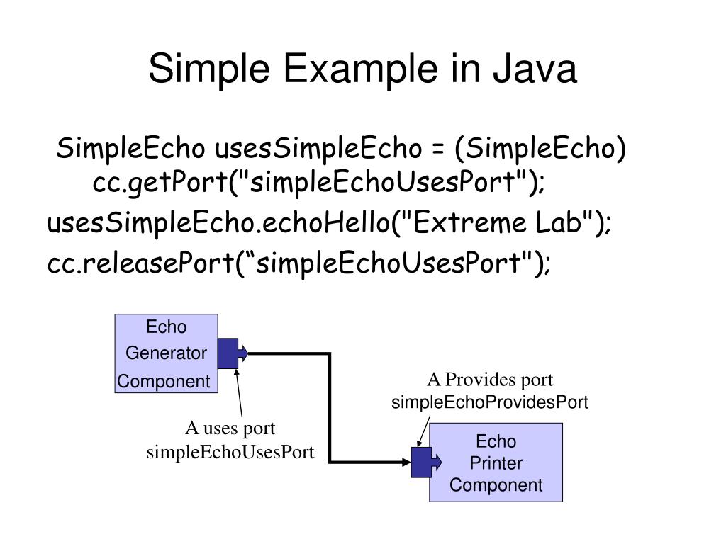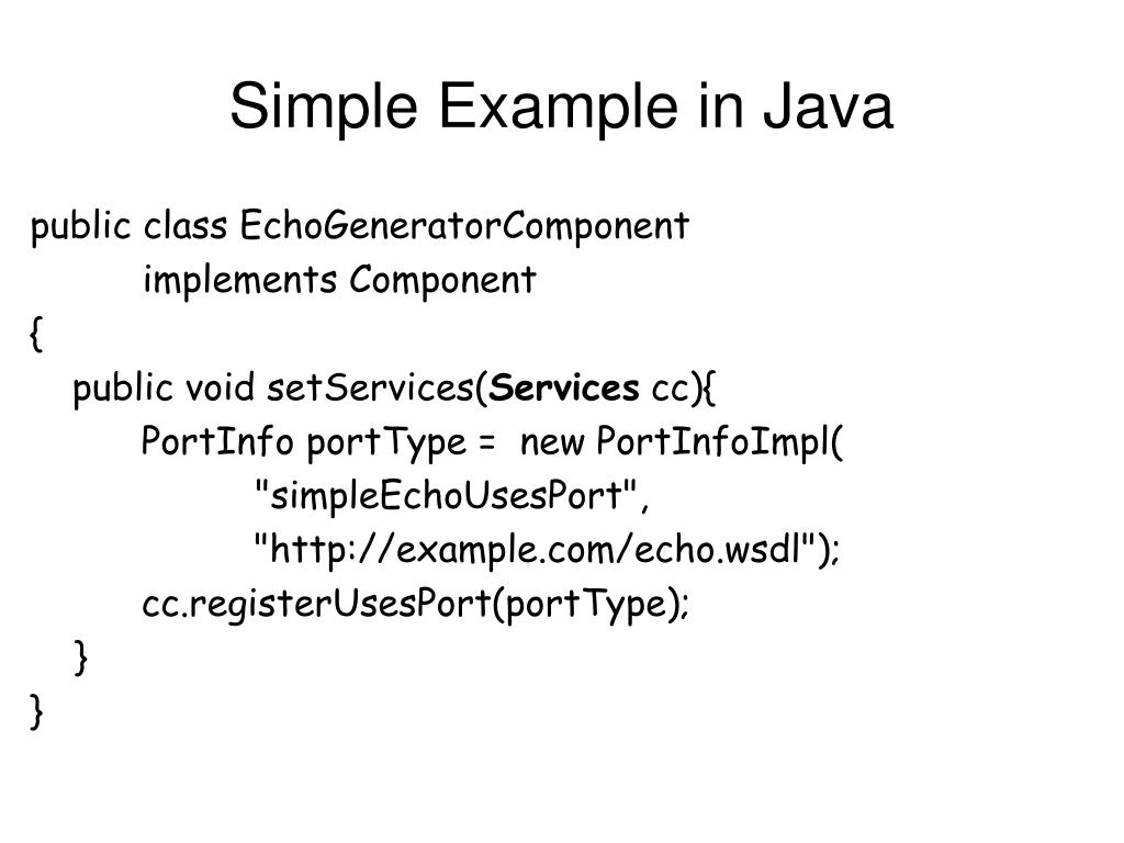 Simple Example in Java public class EchoGeneratorComponent implements Component { public void setServices(Services cc){ PortInfo portType = new PortInfoImpl( "simpleEchoUsesPort", "http://example.com/echo.wsdl"); cc.registerUsesPort(portType); } }