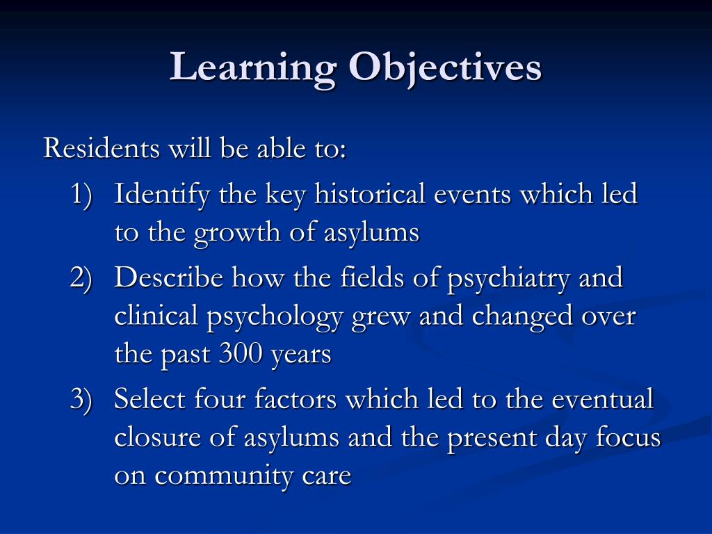 Learning Objectives Residents will be able to: 1) Identify the key historical events which led to the growth of asylums 2) Describe how the fields of psychiatry and clinical psychology grew and changed over the past 300 years 3) Select four factors which led to the eventual closure of asylums and the present day focus on community care