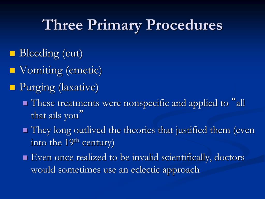Three Primary Procedures • Bleeding (cut) • Vomiting (emetic) • Purging (laxative) • These treatments were nonspecific and applied to “all that ails you” • They long outlived the theories that justified them (even into the 19th century) • Even once realized to be invalid scientifically, doctors would sometimes use an eclectic approach