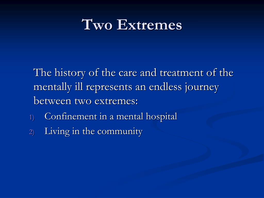 Two Extremes The history of the care and treatment of the mentally ill represents an endless journey between two extremes: • Confinement in a mental hospital • Living in the community