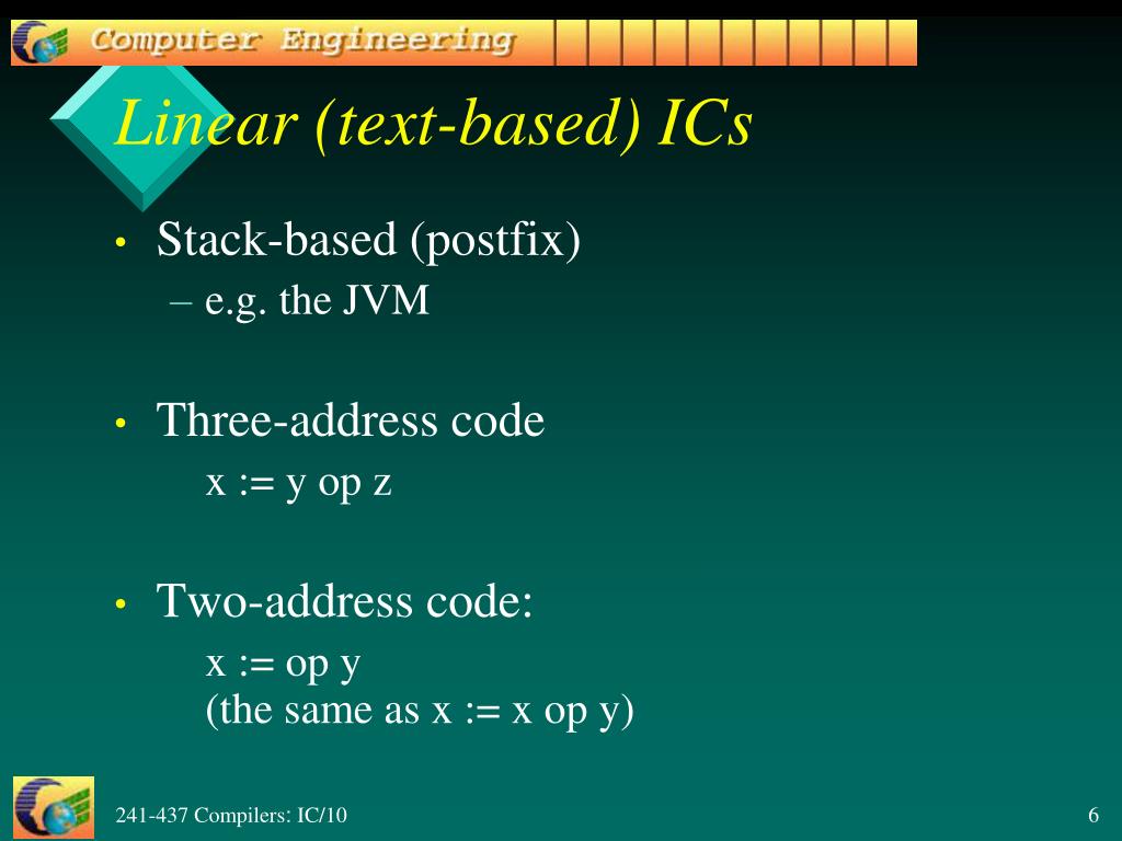 Linear (text-based) ICs • Stack-based (postfix) • e.g. the JVM • Three-address code x := y op z • Two-address code: x := op y(the same as x := x op y)