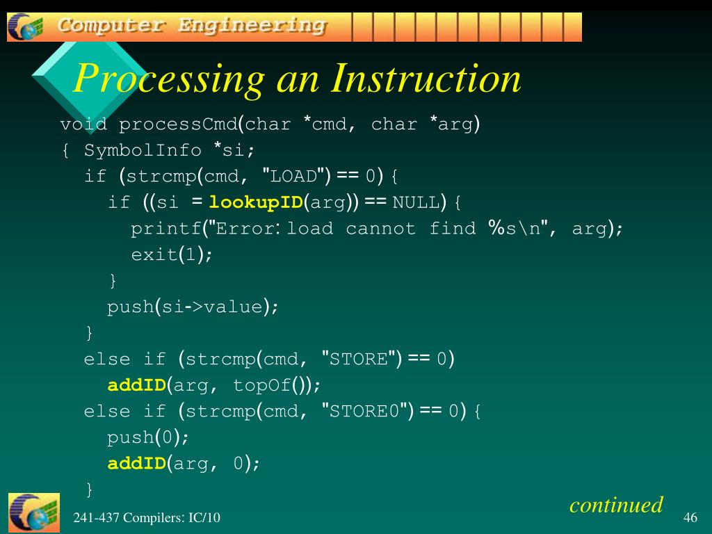Processing an Instruction void processCmd(char *cmd, char *arg) { SymbolInfo *si; if (strcmp(cmd, "LOAD") == 0) { if ((si = lookupID(arg)) == NULL) { printf("Error: load cannot find %s\n", arg); exit(1); } push(si->value); } else if (strcmp(cmd, "STORE") == 0) addID(arg, topOf()); else if (strcmp(cmd, "STORE0") == 0) { push(0); addID(arg, 0); } continued