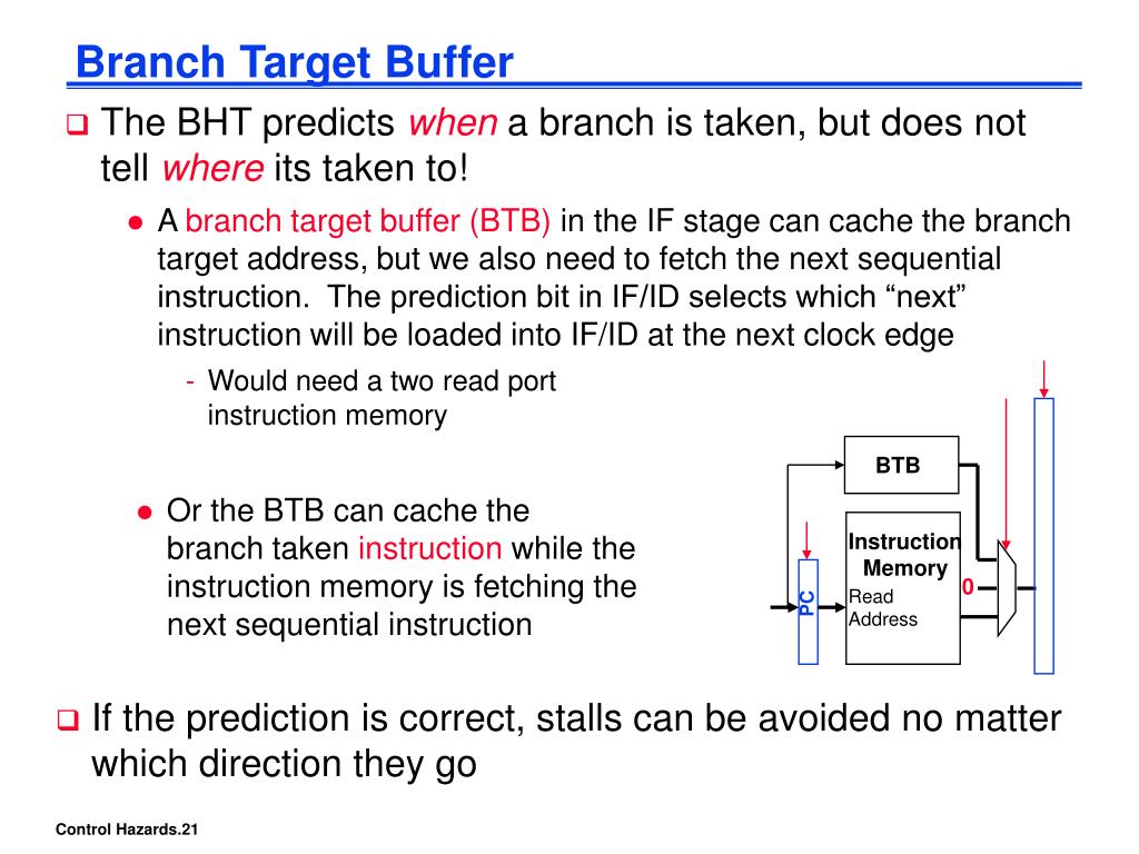 BTB Instruction Memory 0 Read Address PC Branch Target Buffer • The BHT predicts when a branch is taken, but does not tell where its taken to! • A branch target buffer (BTB) in the IF stage can cache the branch target address, but we also need to fetch the next sequential instruction. The prediction bit in IF/ID selects which “next” instruction will be loaded into IF/ID at the next clock edge • Would need a two read port instruction memory • Or the BTB can cache the branch taken instruction while the instruction memory is fetching the next sequential instruction • If the prediction is correct, stalls can be avoided no matter which direction they go