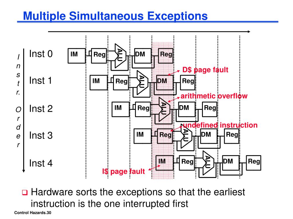 DM Reg Reg IM ALU Where in the Pipeline Exceptions Occur • Arithmetic overflow • Undefined instruction • TLB or page fault • I/O service request • Hardware malfunction Stage(s)? Synchronous? EX ID IF, MEM any any yes yes yes no no • Beware that multiple exceptions can occur simultaneously in a single clock cycle
