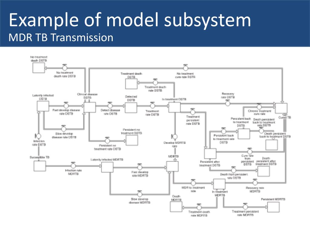 Proposed Approach II: Economic Evaluation • Parameterize and calibrate an already published DSTB-MDRTB-HIV model to match existing data or best possible estimates in pre-program period. • Model employs a systems dynamics methodology to account for interacting variables, interconnected feedback loops involving time delays and non-linear relationships • Explicitly defines states of prevention, detection, treatment • Project incidence, cure and death rates and DALYS forward for study horizon for treatment population to generate a base case of “no program” • Compute cost per death averted/DALY estimates for the program relative to “no program” • Conduct uncertainty analysis