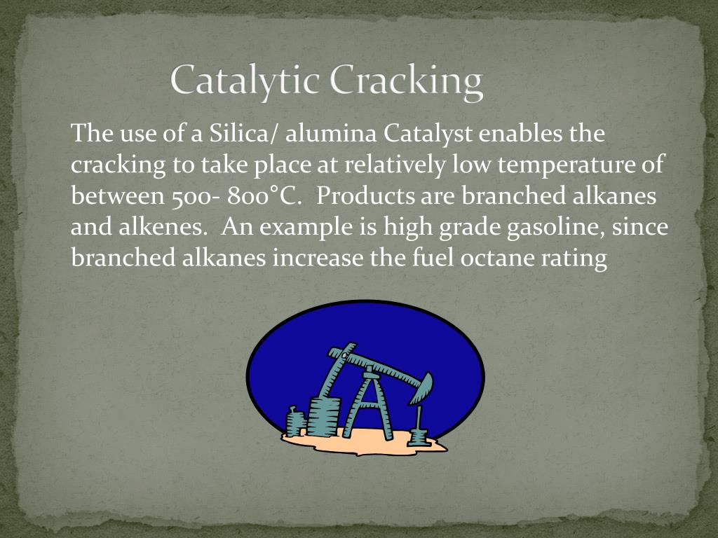 Catalytic Cracking The use of a Silica/ alumina Catalyst enables the cracking to take place at relatively low temperature of between 500- 800°C. Products are branched alkanes and alkenes. An example is high grade gasoline, since branched alkanes increase the fuel octane rating