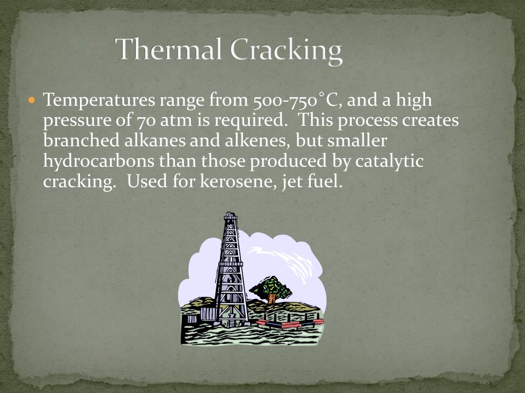 Thermal Cracking • Temperatures range from 500-750°C, and a high pressure of 70 atm is required. This process creates branched alkanes and alkenes, but smaller hydrocarbons than those produced by catalytic cracking. Used for kerosene, jet fuel.