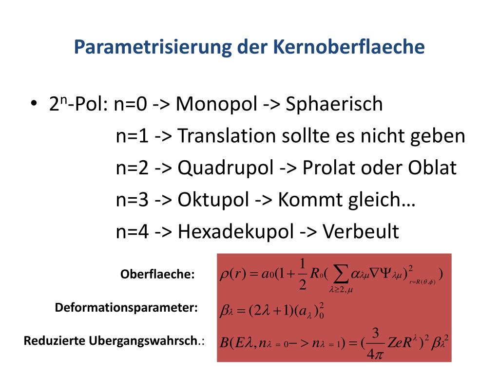 Parametrisierung der Kernoberflaeche • 2n-Pol: n=0 -> Monopol -> Sphaerisch n=1 -> Translation sollteesnichtgeben n=2 -> Quadrupol -> ProlatoderOblat n=3 -> Oktupol -> Kommtgleich… n=4 -> Hexadekupol -> Verbeult Oberflaeche: Deformationsparameter: Reduzierte Ubergangswahrsch.: