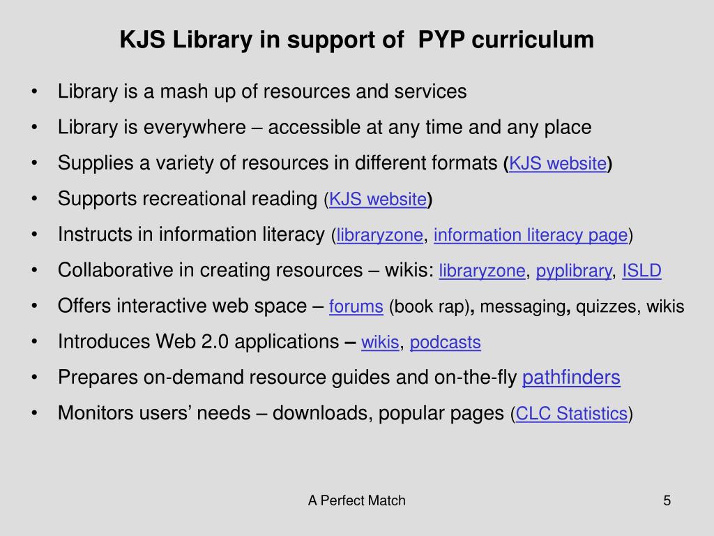 KJS Library in support of PYP curriculum • Library is a mash up of resources and services • Library is everywhere – accessible at any time and any place • Supplies a variety of resources in different formats(KJS website) • Supports recreational reading(KJS website) • Instructs in information literacy(libraryzone, information literacy page) • Collaborative in creating resources – wikis:libraryzone, pyplibrary, ISLD • Offers interactive web space –forums (book rap), messaging, quizzes, wikis • Introduces Web 2.0 applications – wikis, podcasts • Prepares on-demand resource guides and on-the-fly pathfinders • Monitors users’ needs – downloads, popular pages (CLC Statistics) A Perfect Match