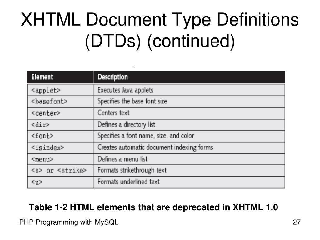 XHTML Document Type Definitions (DTDs) (continued) Table 1-2 HTML elements that are deprecated in XHTML 1.0 PHP Programming with MySQL