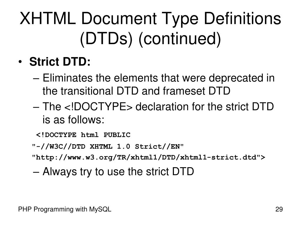 XHTML Document Type Definitions (DTDs) (continued) • Strict DTD: • Eliminates the elements that were deprecated in the transitional DTD and frameset DTD • The <!DOCTYPE> declaration for the strict DTD is as follows: <!DOCTYPE html PUBLIC "-//W3C//DTD XHTML 1.0 Strict//EN" "http://www.w3.org/TR/xhtml1/DTD/xhtml1-strict.dtd"> • Always try to use the strict DTD PHP Programming with MySQL