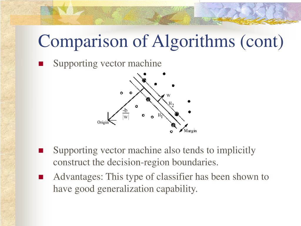 Comparison of Algorithms (cont) • Supporting vector machine • Supporting vector machine also tends to implicitly construct the decision-region boundaries. • Advantages: This type of classifier has been shown to have good generalization capability.