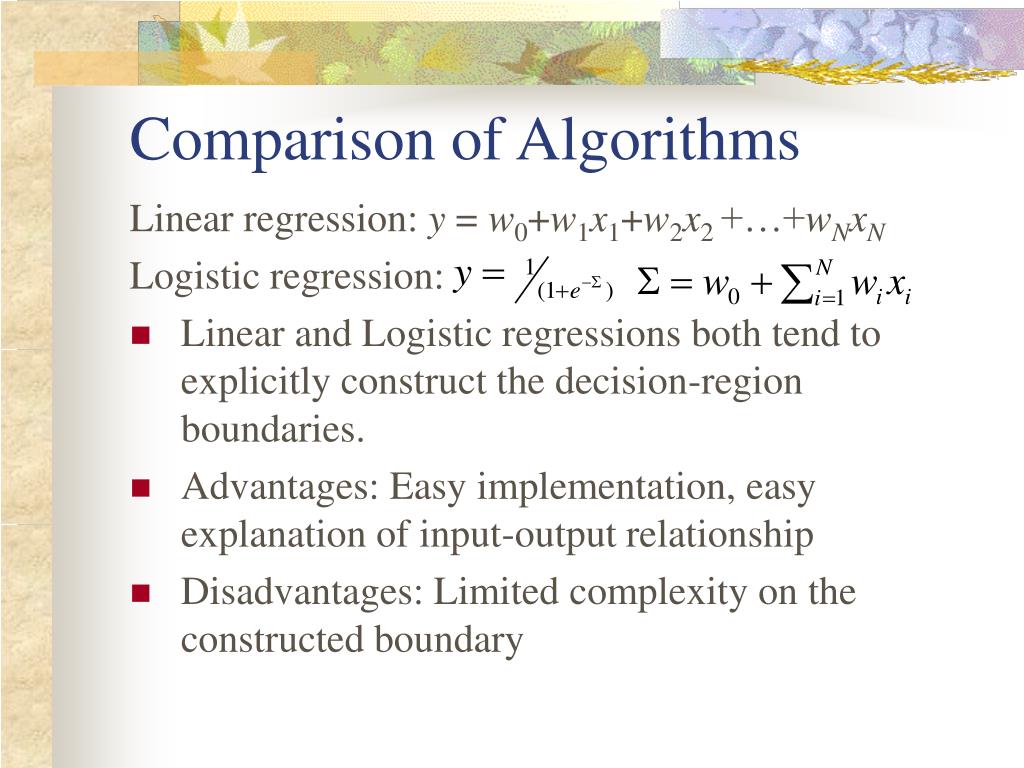 Comparison of Algorithms Linear regression: y = w0+w1x1+w2x2 +…+wNxN Logistic regression: • Linear and Logistic regressions both tend to explicitly construct the decision-region boundaries. • Advantages: Easy implementation, easy explanation of input-output relationship • Disadvantages: Limited complexity on the constructed boundary