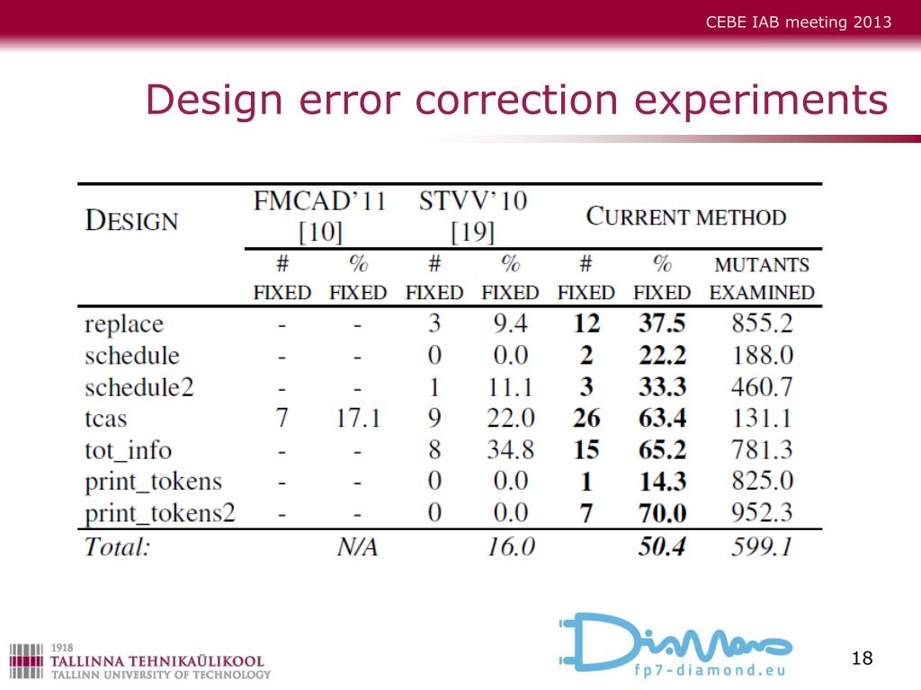 DIAMOND: Targeting Verification and Reliability Issues in Systems • EU FP7 STREP Project DIAMOND • A holistic view of design and soft errors • Success stories: • FoREnSiC (C, system-level) • zamiaCAD (VHDL/Verilog/SC, RTL) • Follow-up projects • Significance to CEBE