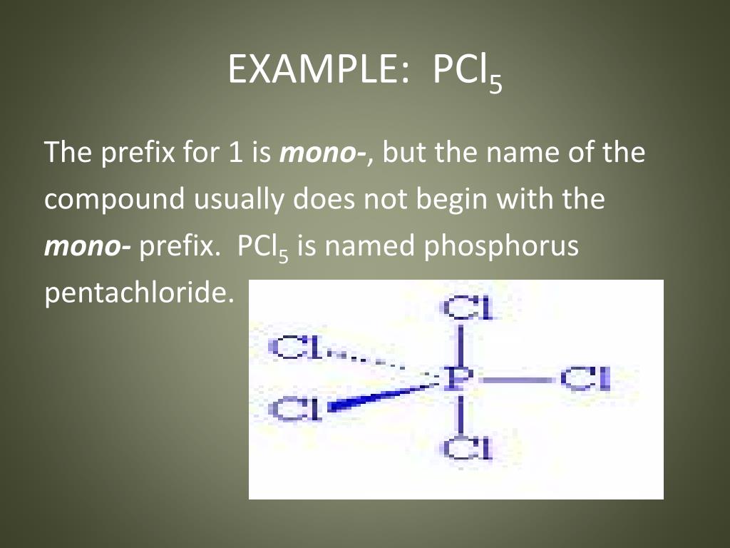 EXAMPLE: PCl5 The prefix for 1 is mono-, but the name of the compound usually does not begin with the mono- prefix. PCl5 is named phosphorus pentachloride.