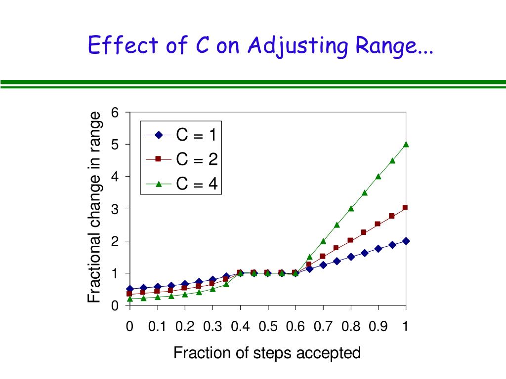Simulated Annealing – Step 4 Periodically adjust the range (VM) within which new steps are chosen... {after nused * ns cycles, adjust VM so that half of evaluations are accepted} If eval mod (nused*ns) = 0 then begin for i := 0 to npmax do if xvary[i] then begin ratio := nacp[i]/ns; { C controls the adjustment of VM (range) - references suggest setting at 2.0} if (ratio > 0.6) then vm[i] := vm[i]*(1.0+c[i]*((ratio - 0.6)/0.4)) else if ratio < 0.4 then vm[i] := vm[i]/(1.0+c[i]*((0.4 - ratio)/0.4)); if vm[i] > (ub[i]-lb[i]) then vm[i] := ub[i] - lb[i]; end; { reset nacp[i]} for i := 1 to npmax do nacp[i] := 0; end; ns is typically ~ 20 This part is strictly ad hoc...