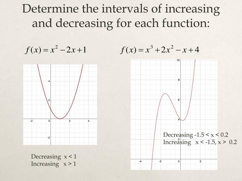 Determine the intervals of increasing and decreasing for each function: Decreasing -1.5 < x < 0.2 Increasing x < -1.5, x > 0.2 Decreasing x < 1 Increasing x > 1