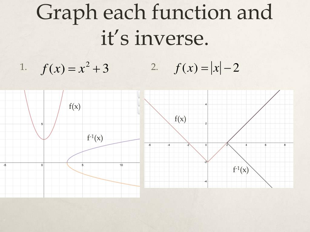 Graph each function and it’s inverse. 1. 2. f(x) f(x) f-1(x) f-1(x)