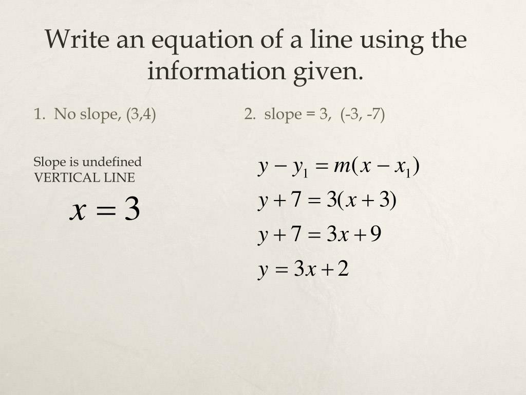 Write an equation of a line using the information given. 1. No slope, (3,4) 2. slope = 3, (-3, -7) Slope is undefined VERTICAL LINE