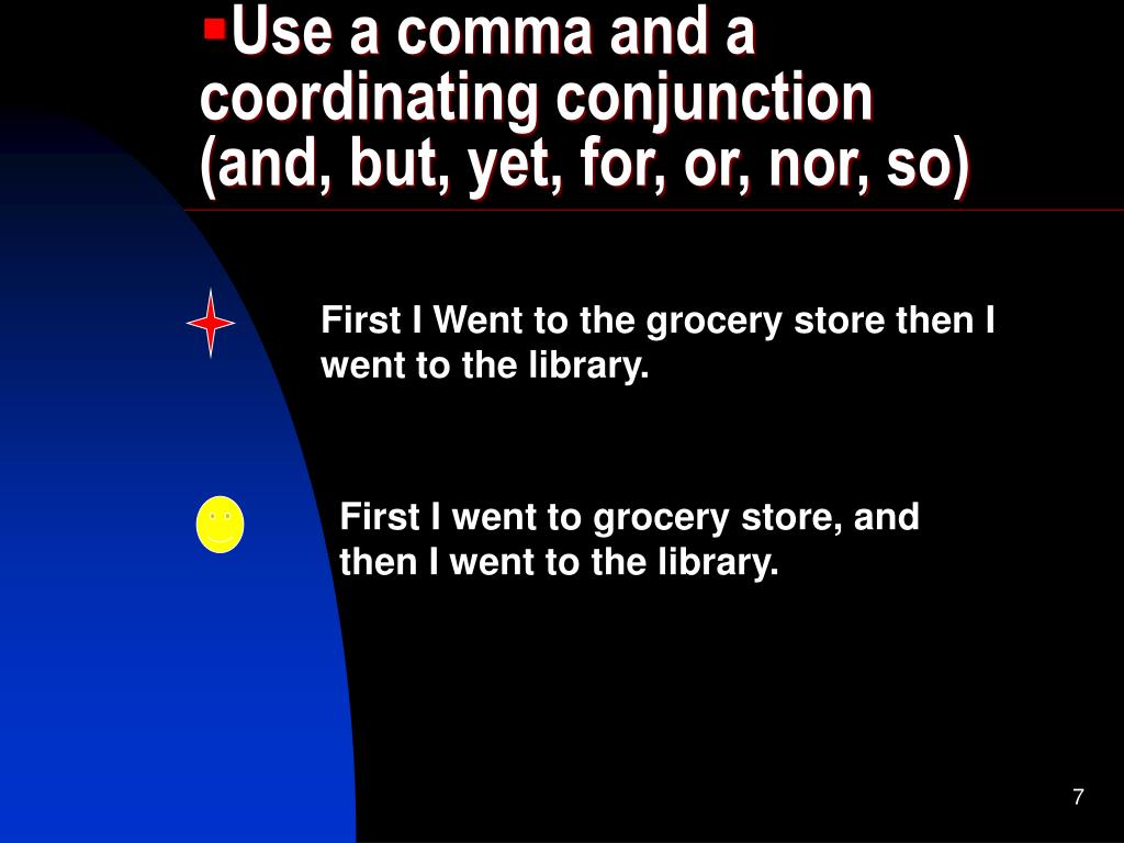 Use a comma and a coordinating conjunction(and, but, yet, for, or, nor, so) First I Went to the grocery store then I went to the library. First I went to grocery store, and then I went to the library.