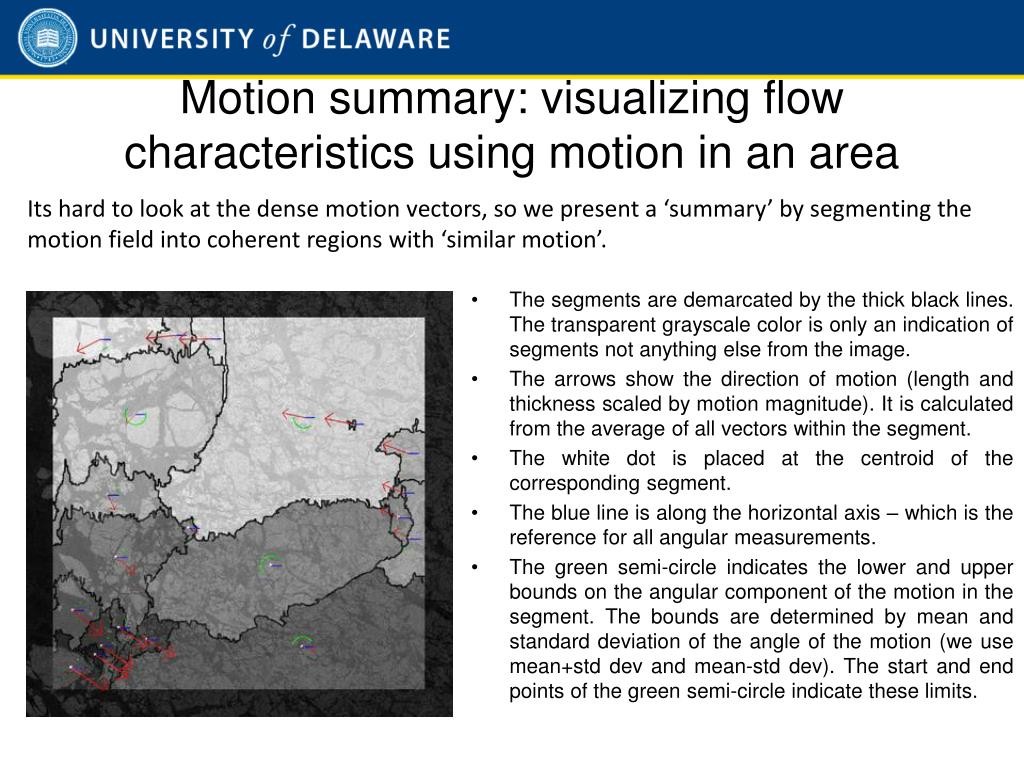 Motion summary: visualizing flow characteristics using motion in an area Its hard to look at the dense motion vectors, so we present a ‘summary’ by segmenting the motion field into coherent regions with ‘similar motion’. • The segments are demarcated by the thick black lines. The transparent grayscale color is only an indication of segments not anything else from the image. • The arrows show the direction of motion (length and thickness scaled by motion magnitude). It is calculated from the average of all vectors within the segment. • The white dot is placed at the centroid of the corresponding segment. • The blue line is along the horizontal axis – which is the reference for all angular measurements. • The green semi-circle indicates the lower and upper bounds on the angular component of the motion in the segment. The bounds are determined by mean and standard deviation of the angle of the motion (we use mean+std dev and mean-std dev). The start and end points of the green semi-circle indicate these limits.