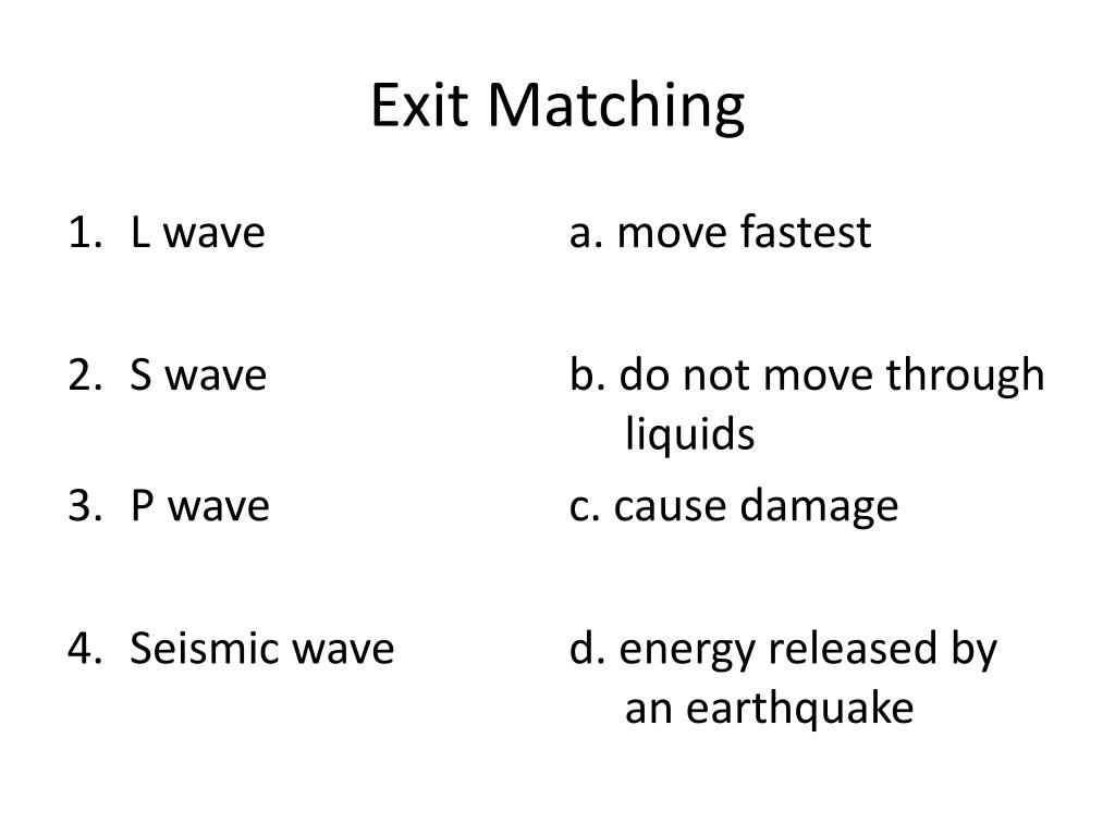 Exit Matching • L wave a. move fastest • S wave b. do not move through liquids • P wave c. cause damage • Seismic wave d. energy released by an earthquake