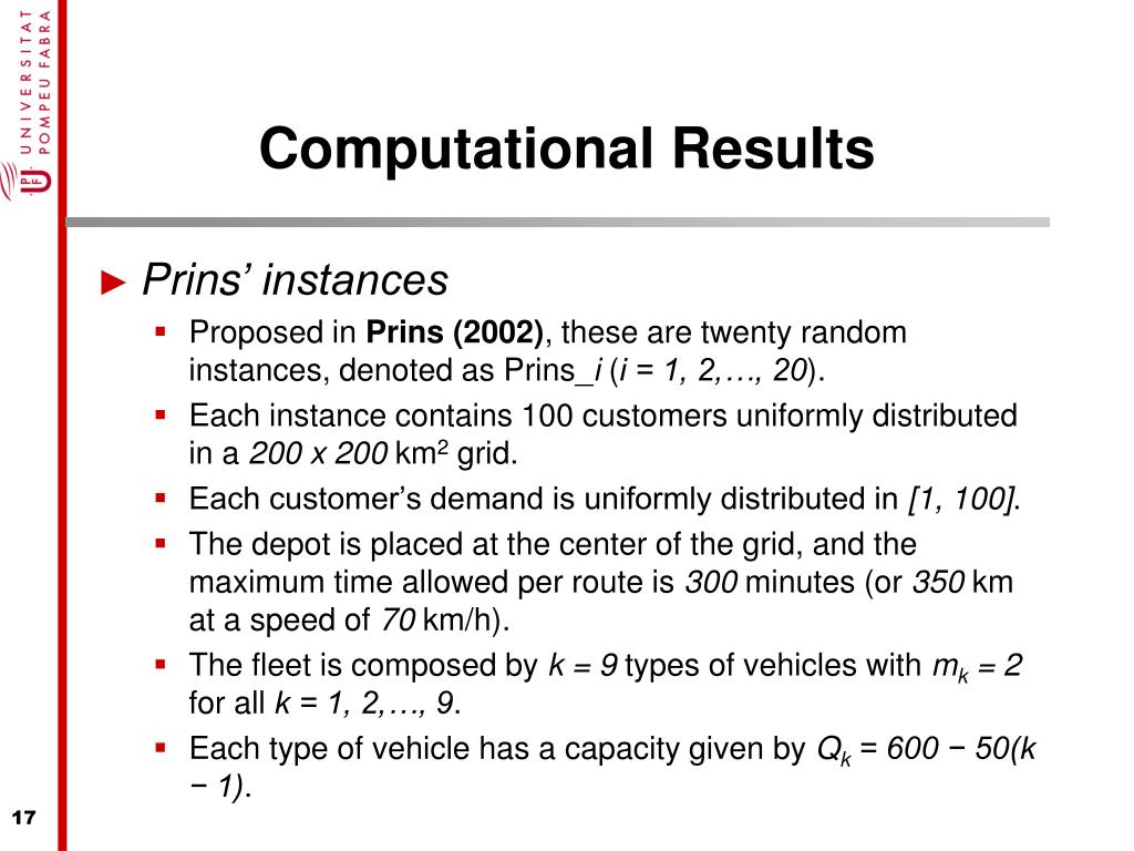 Computational Results • Prins’ instances • Proposed in Prins (2002), these are twenty random instances, denoted as Prins_i (i = 1, 2,…, 20). • Each instance contains 100 customers uniformly distributed in a 200 x 200 km2 grid. • Each customer’s demand is uniformly distributed in [1, 100]. • The depot is placed at the center of the grid, and the maximum time allowed per route is 300 minutes (or 350 km at a speed of 70 km/h). • The fleet is composed by k = 9 types of vehicles with mk = 2 for all k = 1, 2,…, 9. • Each type of vehicle has a capacity given by Qk = 600 − 50(k − 1).
